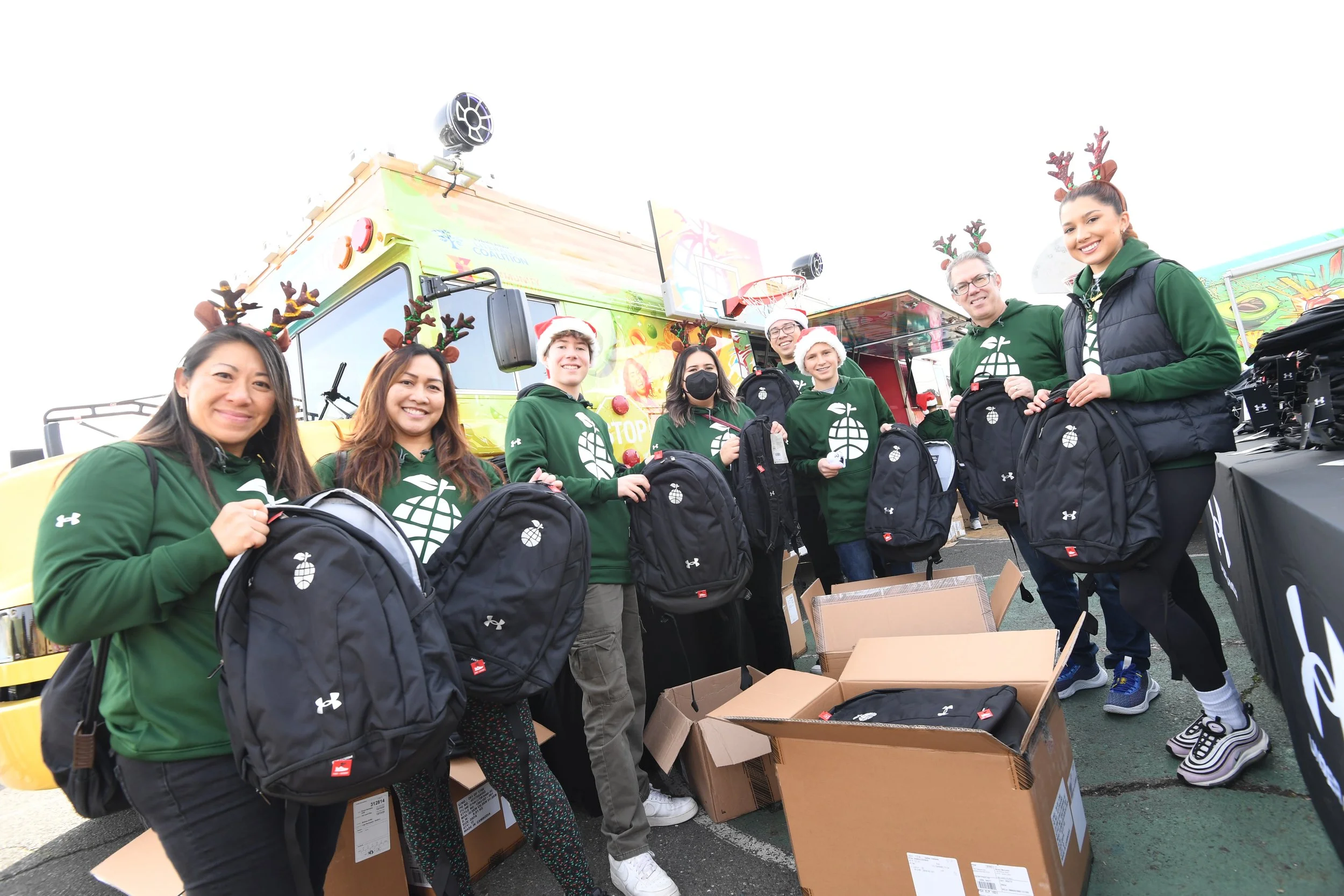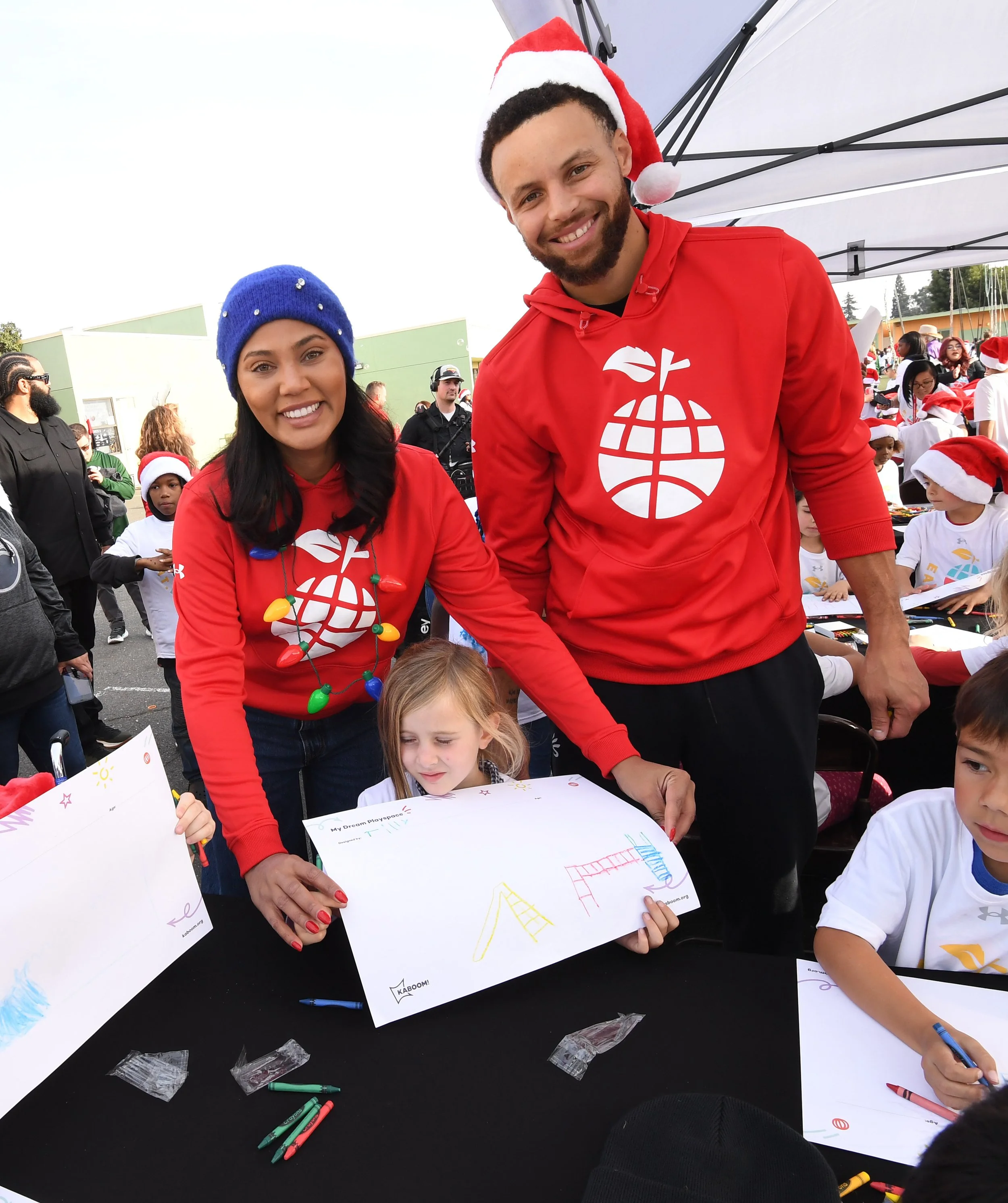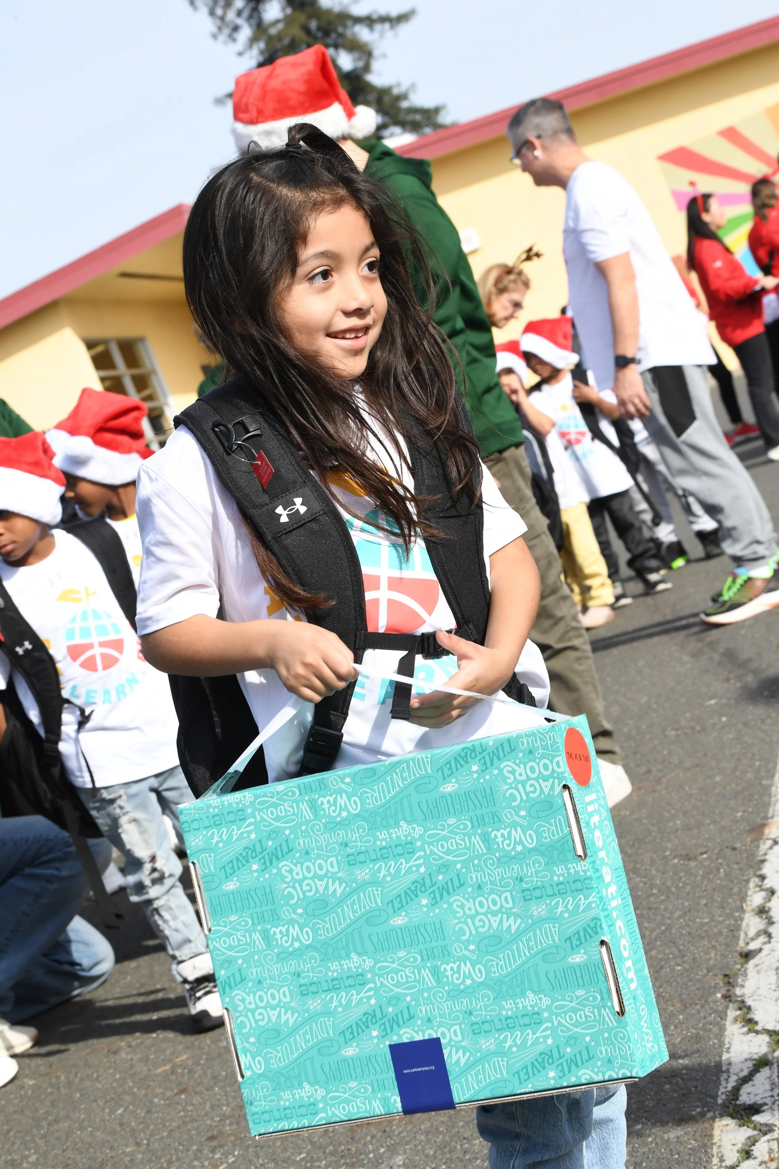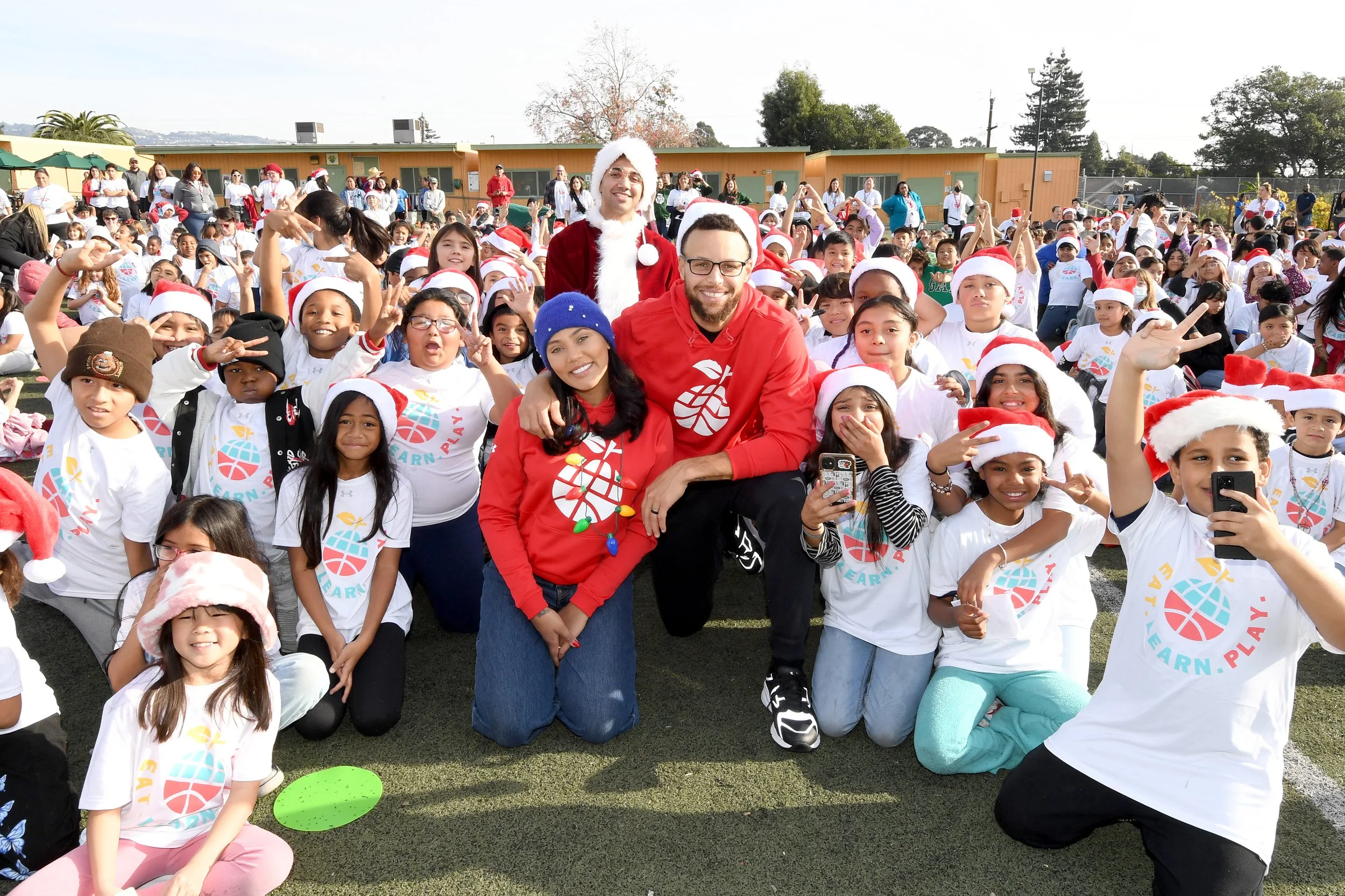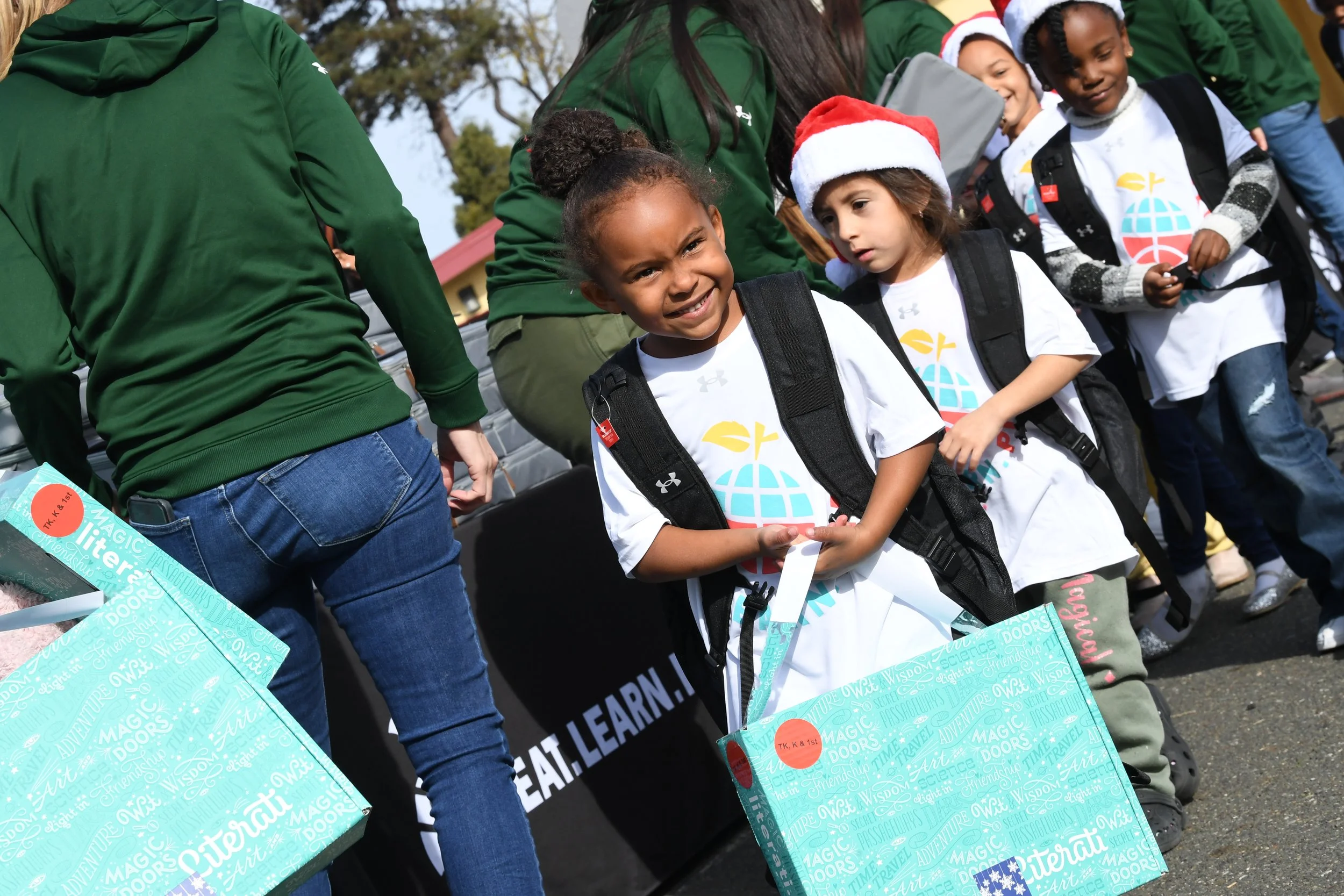 On December 15th, Eat. Learn. Play. hosted a special Christmas with the Currys event at Manzanita Campus. On this day, 800 students had their book gift boxes specially delivered by Stephen and Ayesha, along with the Eat. Learn. Play. team and our village of volunteers and partners. In addition, each student was provided healthy snacks and fresh fruit, new backpacks and gear from Under Armour, new lunchboxes from Rakuten, and other goodies. With the help of Stephen and Ayesha Curry, Eat. Learn. Play. staff, and volunteers, students enjoyed holiday festivities including games, activity stations and music from DJ D Sharp.